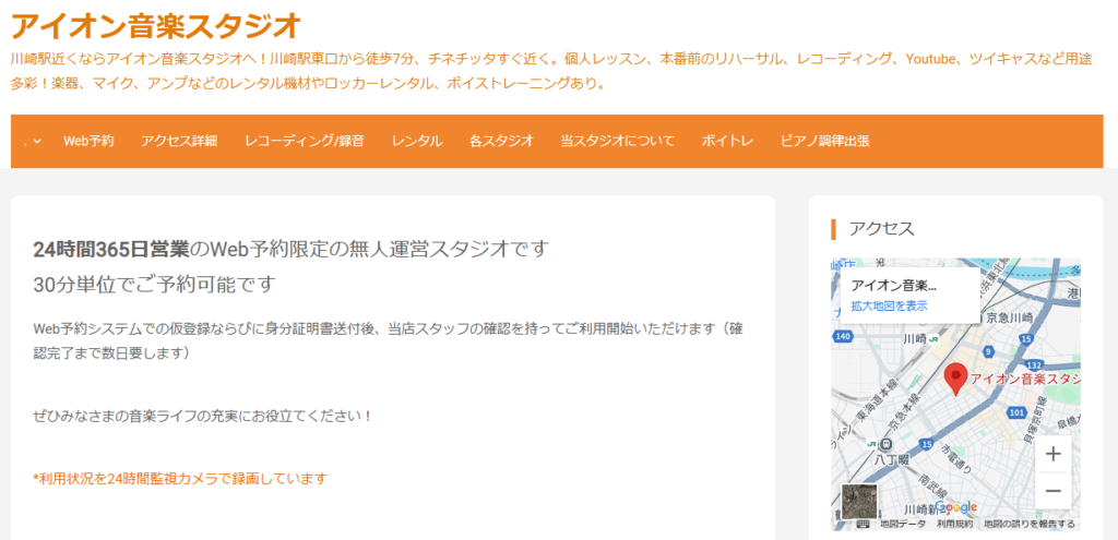 特徴:川崎駅東口から徒歩7分、24時間365日営業の無人音楽スタジオです。